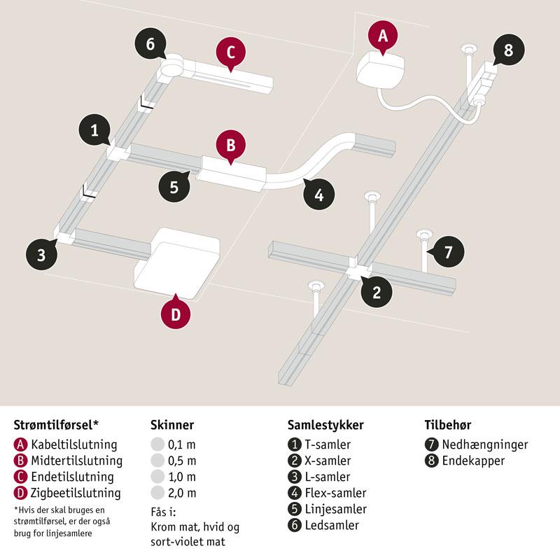 Du har brug for et samlestykke for at kunne forbinde skinnerne med hinanden. Vælg mellem L,- T- eller Flex-samlestykker for at sikre optimal belysning af samtlige boligsituationer. Med disse produkter forbinder du skinnerne med strømtilslutningen samt skinnerne med hinanden.